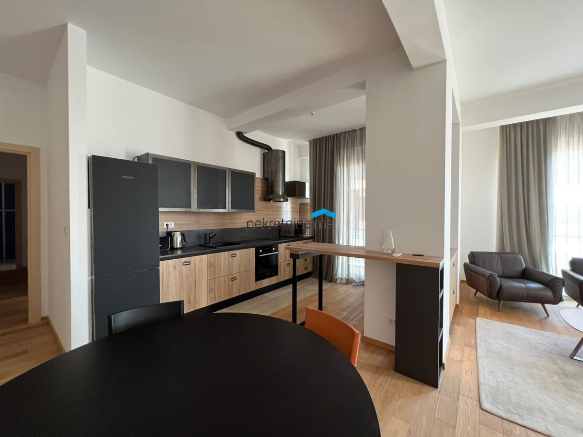A new luxurious two-bedroom apartment of 128m2 is for sale. It is located behind Capital Plaza, in the new residential and business building “Oaza”. The apartment is very bright, spacious and comfortable. It has a two-bedroom structure (according to the project it is a three-bedroom, but the owner converted it into a two-bedroom), south-west oriented with a view of the yard.