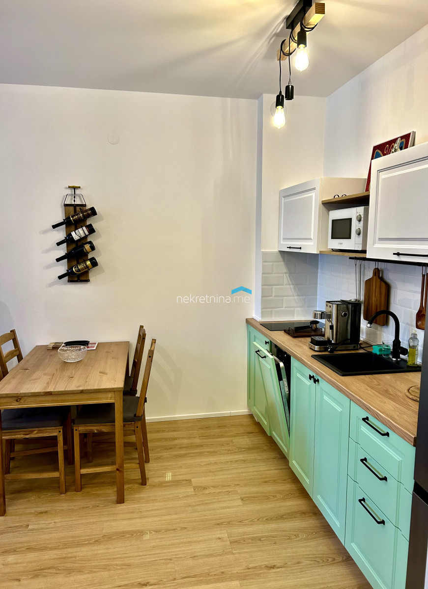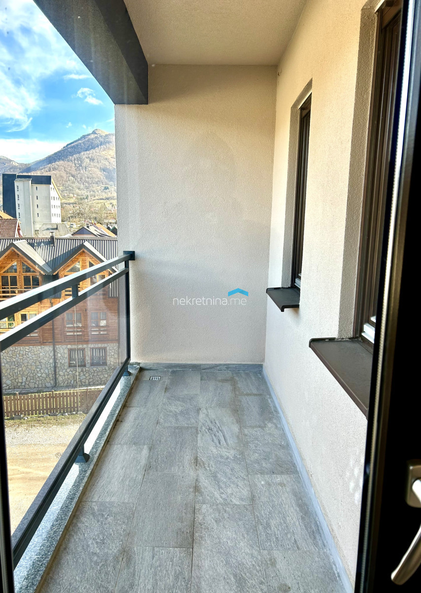 Prostran i potpuno nov apartman, u stambenoj zgradi na putu za ski-centar Bjelasica. Apartman je površine 43m2, a sastoji se od ulaznog hodnika, dnevne sobe sa kuhinjom i trpezarijom, spavaće sobe i terase. Opremljen je novim i kvalitetnim stvarima i nije korišćen.